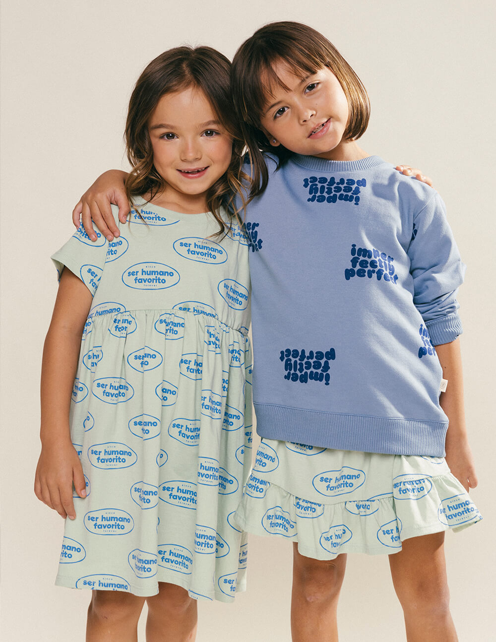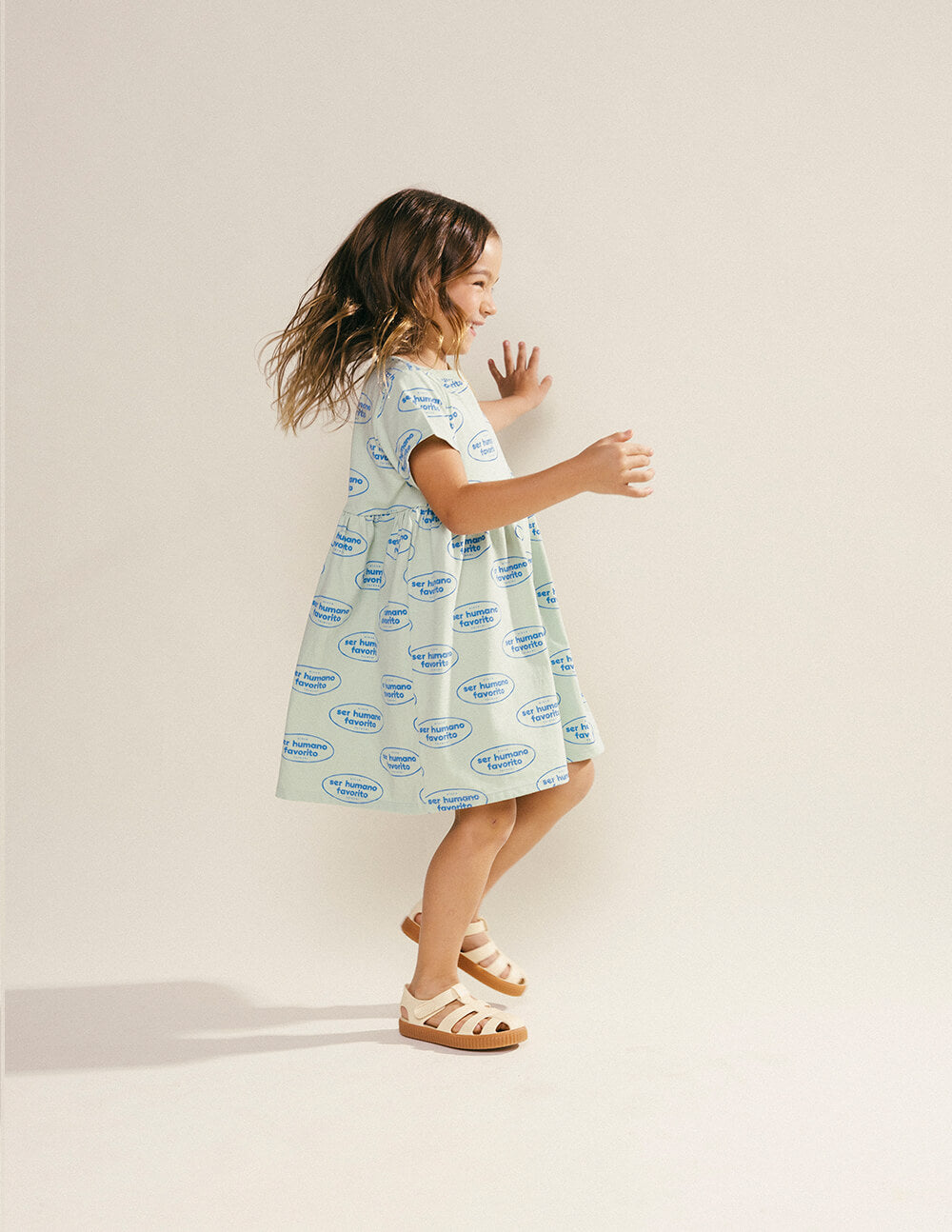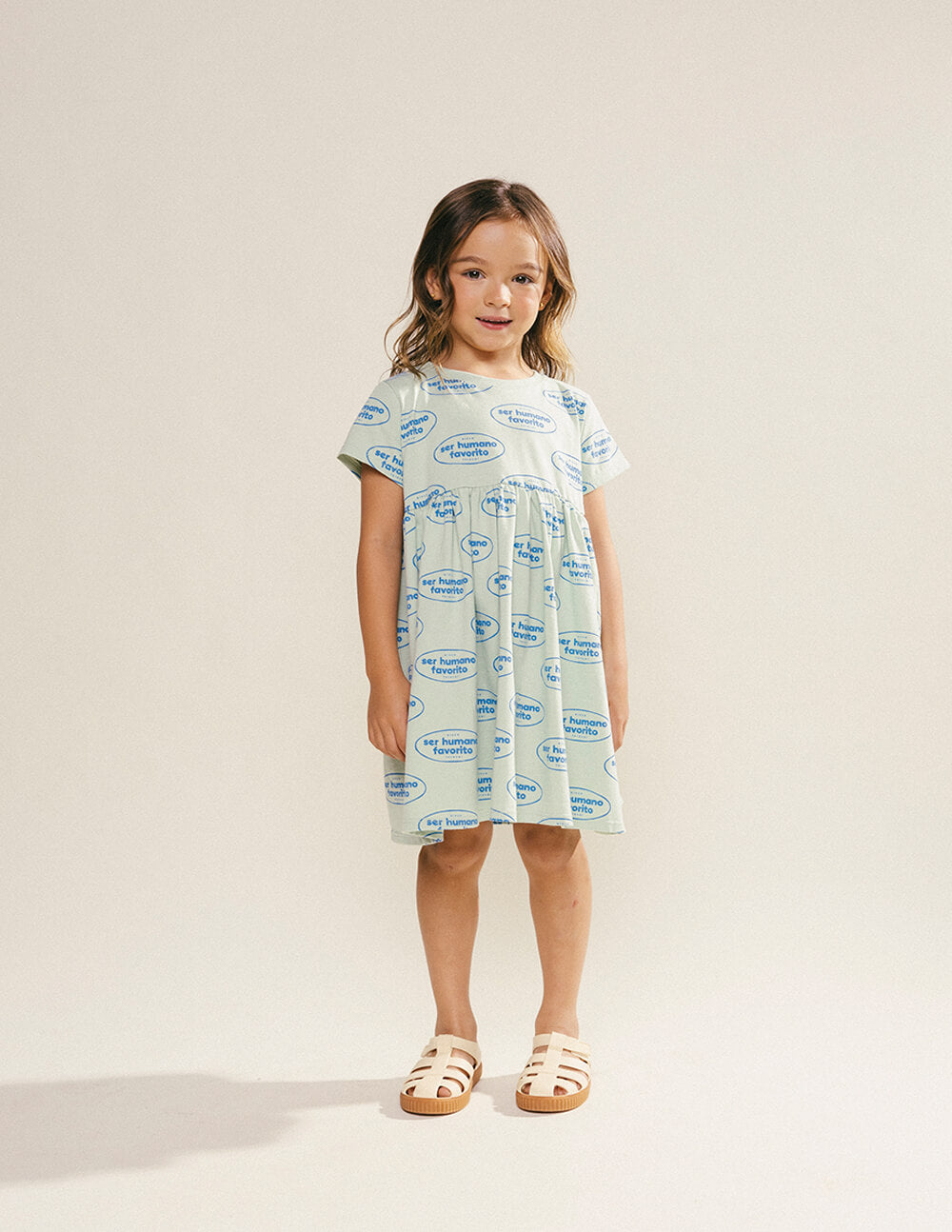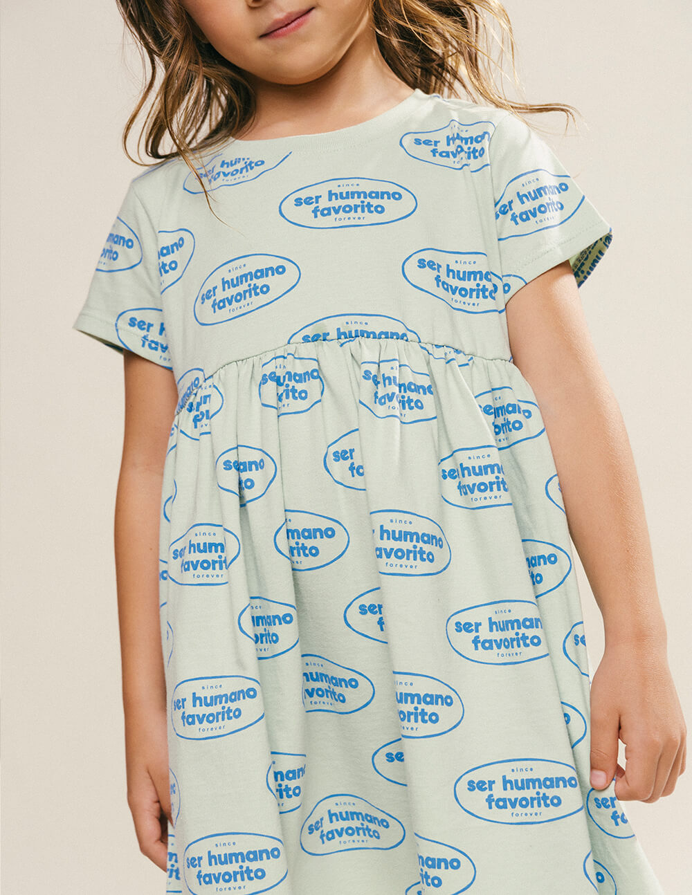 Vestido corto, muy fresco y cómodo, de manga corta y cuello redondo, con corte y recogido en el pecho. Estampado de sellos con textos que dicen "Ser humano favorito" en color azul sobre tela verde pastel. Un mundo mejor comienza en los corazones de nuestros niños, nuestros seres humanos favoritos. Vistamos su día a día con esperanza, para que con cada paso, siembren paz y cosechen un universo de amor. Por ser una prenda hecha en algodón pima peruano garantiza una frescura y calidad inigualable.