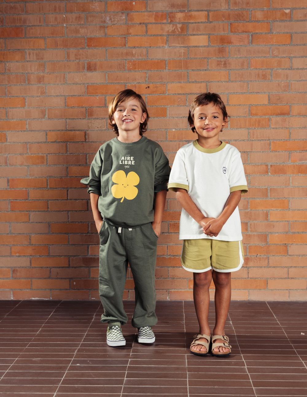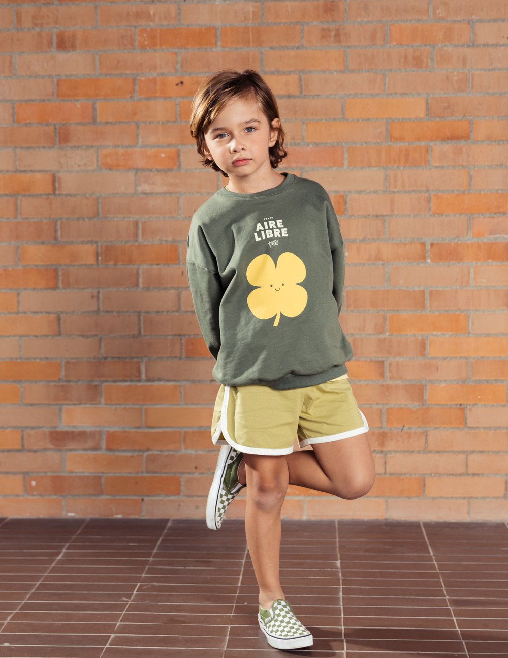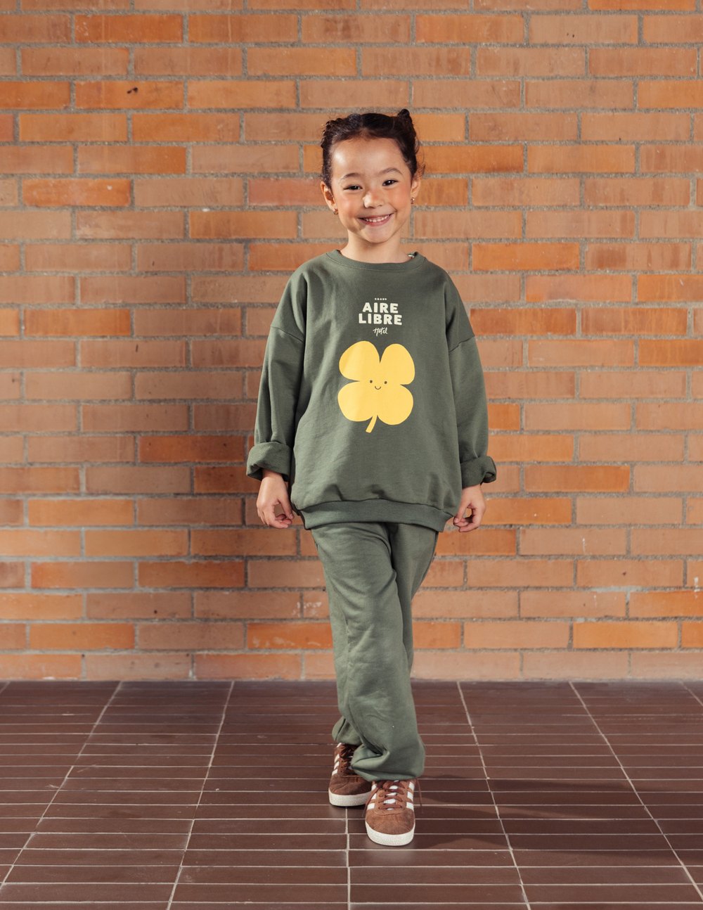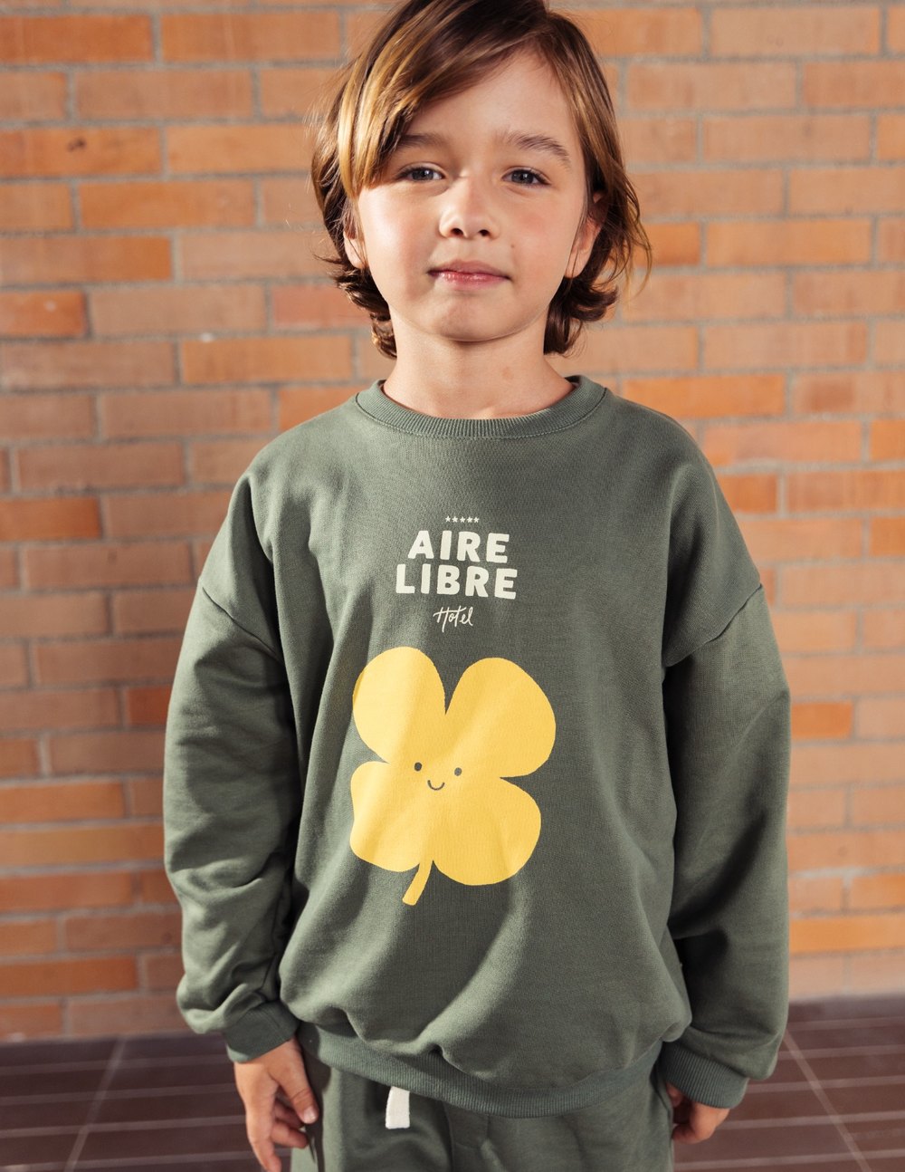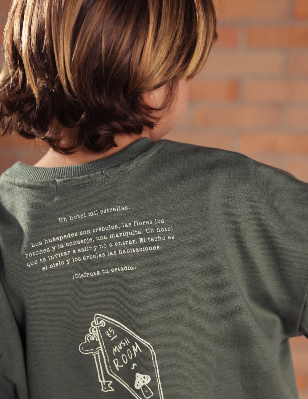 Un recordatorio de que la mejor estadía siempre está afuera. Este buzo verde oliva invita a vivir la experiencia del Hotel Aire Libre: un lugar con mil estrellas, habitaciones de tréboles y un techo de cielo abierto. En el frente, un trébol sonriente transmite buena suerte y alegría; en la espalda, un guiño lúdico con el texto que narra la magia de este universo.