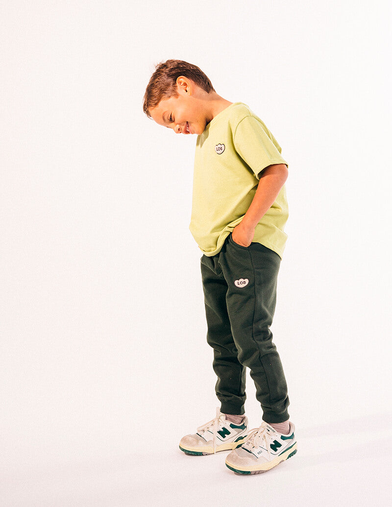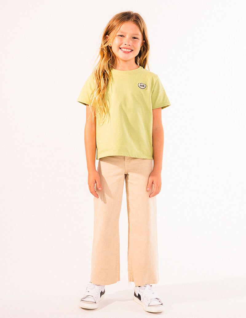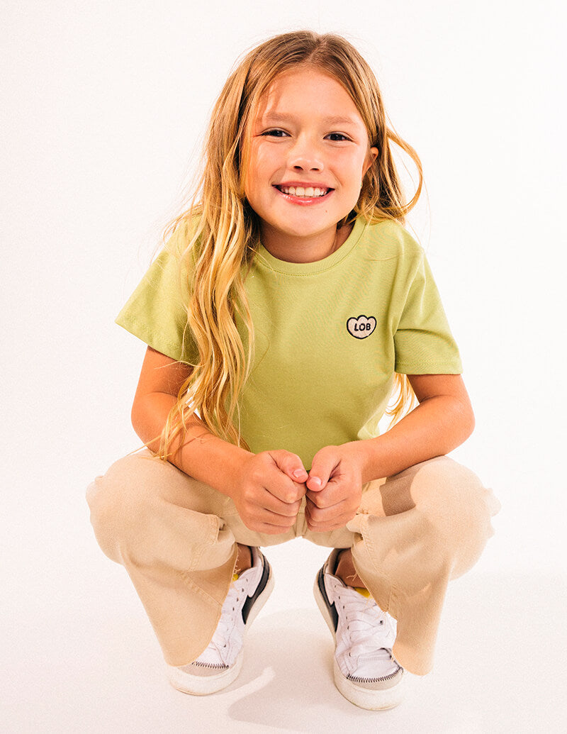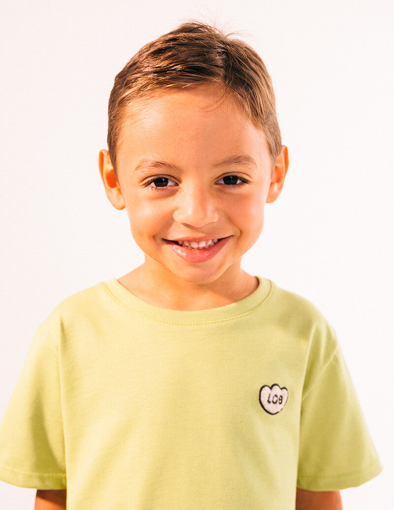 Camiseta infantil, para niñas y niños, con fit suelto, de manga corta, cuello redondo con rib y detalle de "LOB" bordado con textura súper suavecita en el pecho. Esta camiseta tiene un color verde tan ceremonial como el té matcha. Nos encanta!
